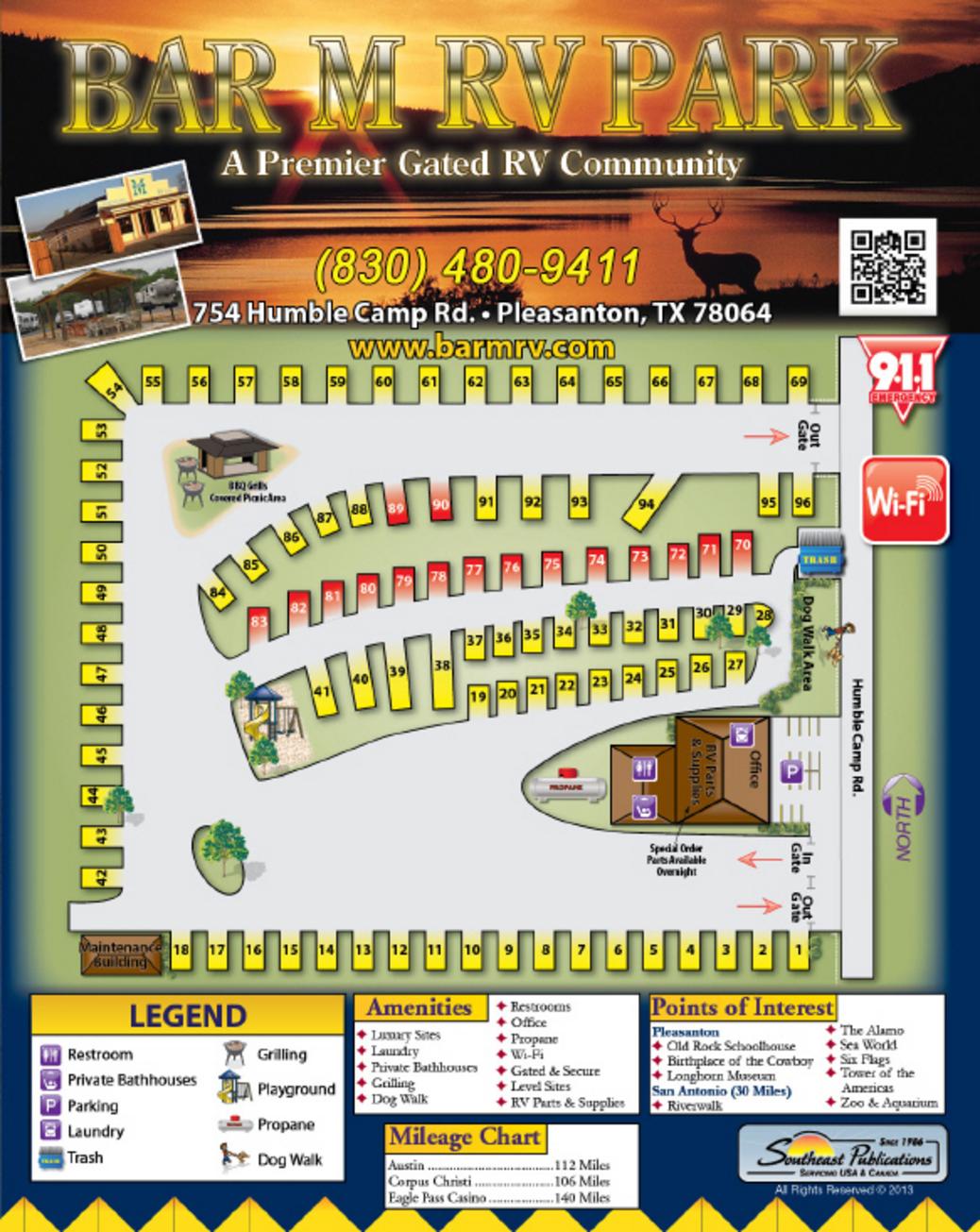 Our amenities include: Gated entry, paved roads and sites, 24/7 laundromat, dog park, free ice, private showers, wifi, bbq and picnic area, propane fill station, playground, paid utilities, RV parts sales and more!
